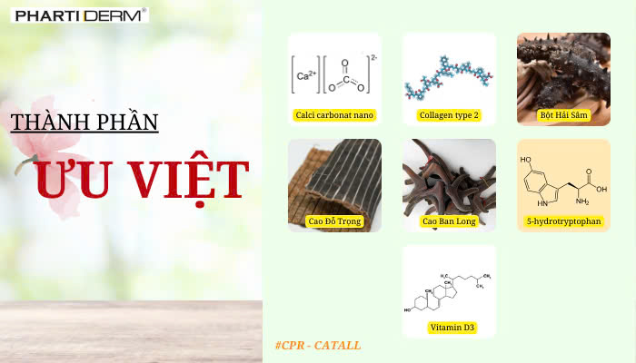 CPR – CATALL là một chế phẩm có chứa Canxi Nano và nhiều dưỡng chất quý như: Hải sâm, Cao đỗ trọng, Cao ban long, 5 – Hydrotryptophan và vitamin D3 vô cùng cần thiết cho cơ thể, giúp: