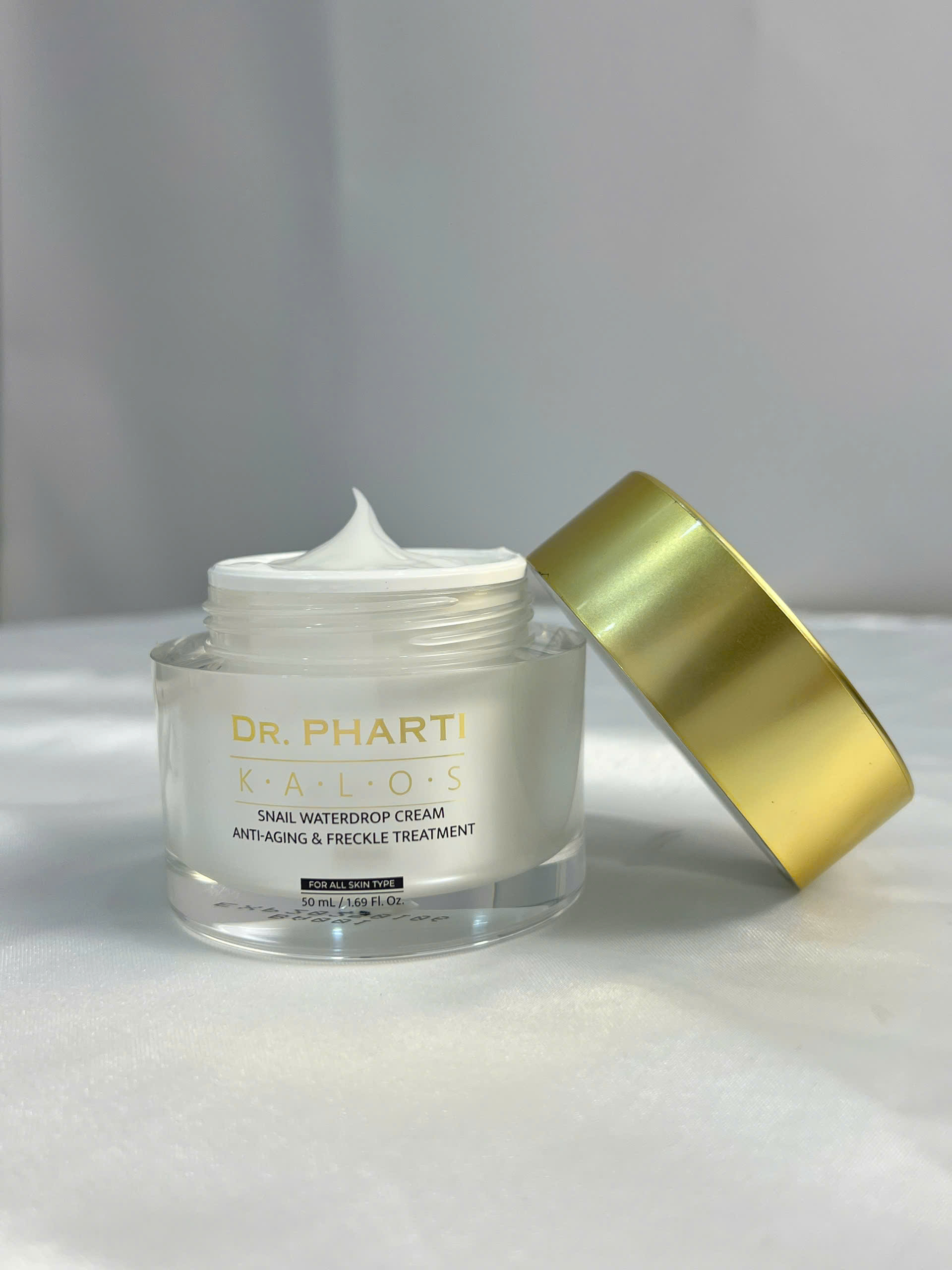 DR.PHARTI - K.A.L.O.S SNAIL WATERDROP CREAM là kem dưỡng ẩm chuyên sâu ngừa thâm nám và nếp nhăn, sỡ hữu nhiều ưu điểm ngăn ngừa dấu hiệu lão hóa mang lại vẻ đẹp tươi trẻ cho làn da. Với sự kết hợp giữa Tinh chất dịch chiết ốc sên đậm đặc, Tranexamic axid với các thành phần thảo mộc từ thiên nhiên cung cấp độ ẩm dồi dào nên sản phẩm dễ dàng thấm sâu vào lớp biểu bì da giúp da hấp thụ tối đa dưỡng chất của cream mang đến làn da sáng mịn rạng ngời.