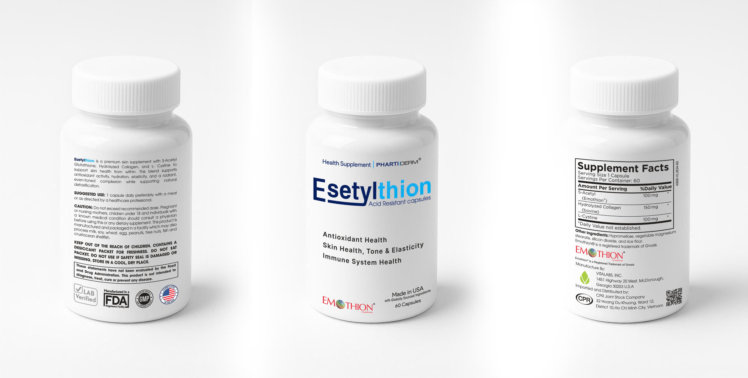 Sản phẩm Esetylthion viên uống sáng da chống lão hóa, thuộc thương hiệu Pharti Derm được nhập khẩu từ Mỹ. Với công thức đặc biệt, sản phẩm mang lại nhiều lợi ích cho cơ thể, đặc biệt là cho làn da. Điểm nổi bật của Esetylthion chính là thành phần S-Acetyl L-Glutathione, một dạng acetyl hóa của glutathione, kết hợp với dạng bào chế viên nang kháng axit, giúp tối ưu hóa hiệu quả sử dụng và mang lại những công dụng tuyệt vời cho sản phẩm :